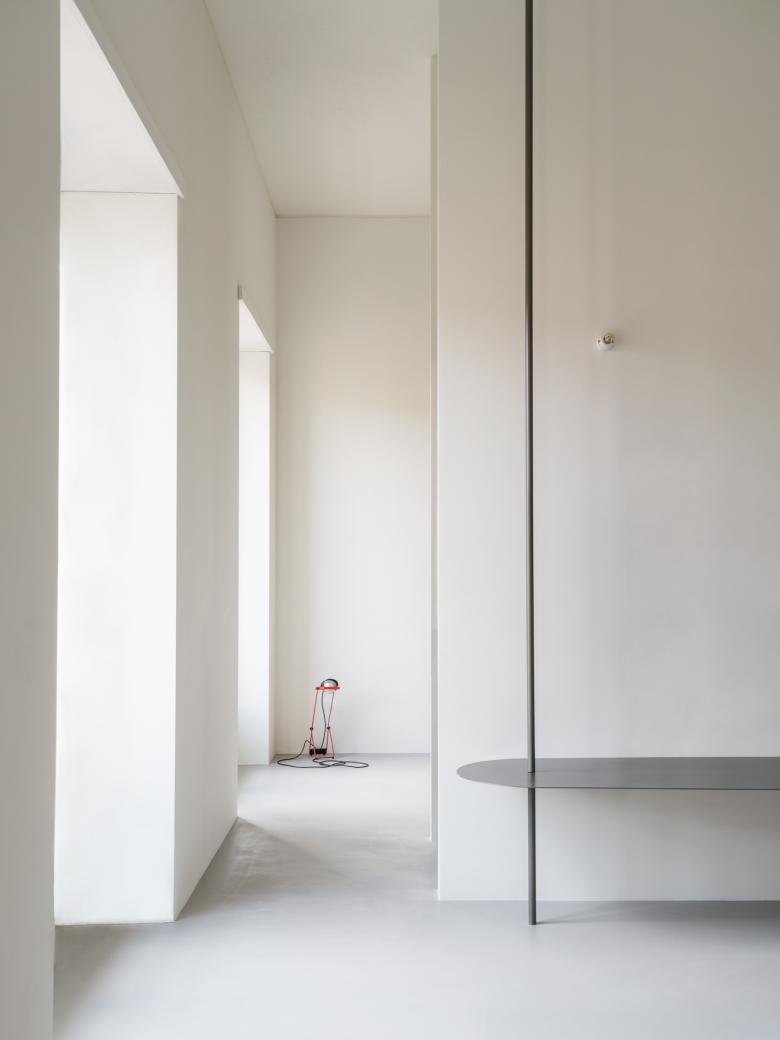 The metal bespoke furnishings explicitly designed for the apartment, complete the chromatic and material study of the intervention, they are conceived as slender and essential elements with the dual function of characterizing the space and containing the costs. The kitchen in stainless steel is designed as a monolith, a precious and essential object that becomes the protagonist of the entire living area. This project is part of the Firm’s research on minimal domestic spaces and specifically on the potential for radical transformation of environments starting from a limited budget.