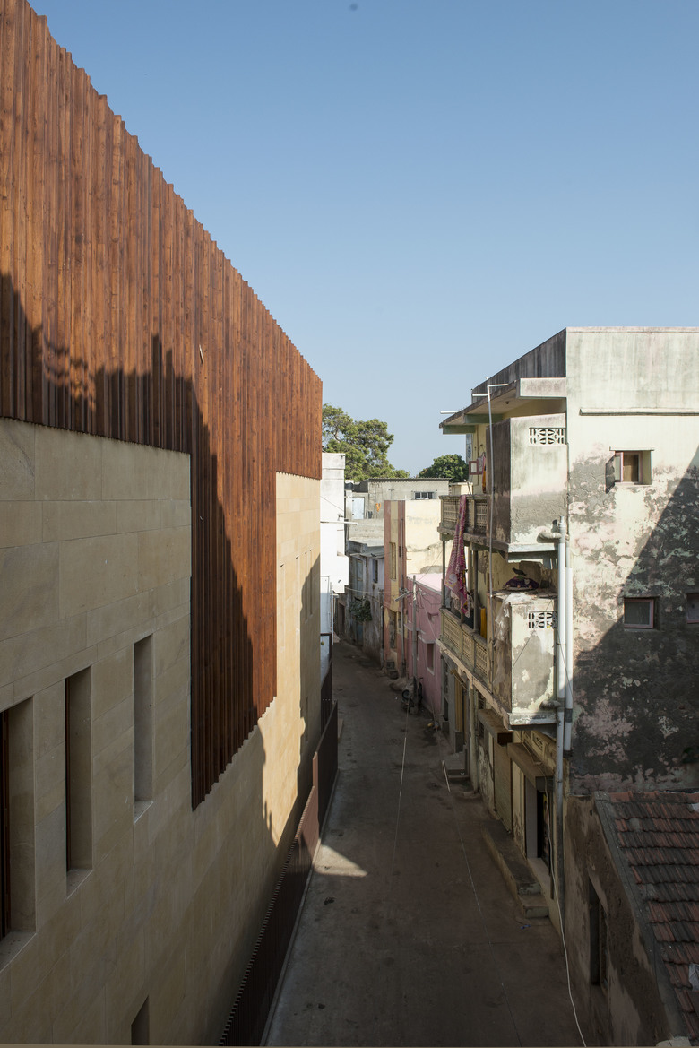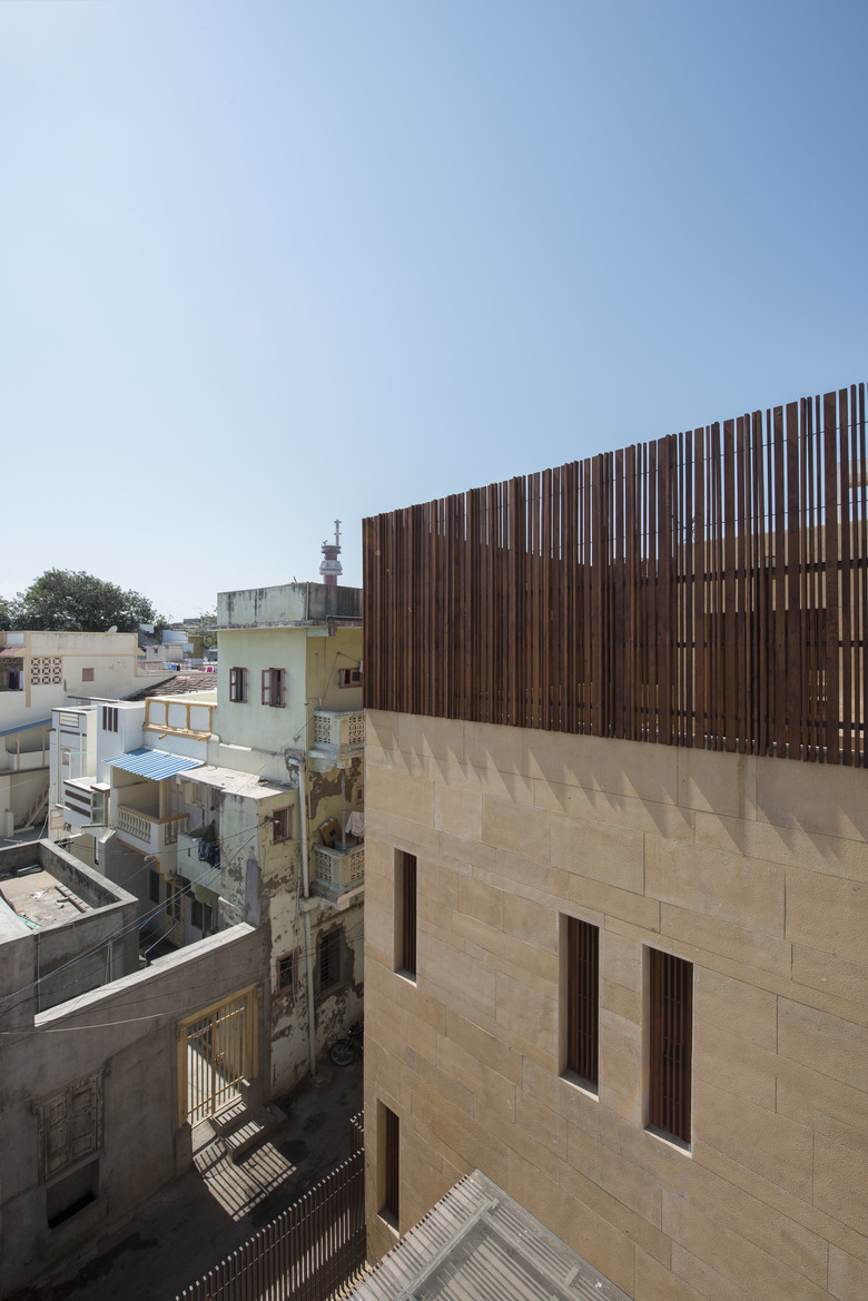 The timber jaali wraps around the terrace to create an intimate lounging space for cool evenings, from where one may gaze out at the spectacle of the Kutch sky. The blue of the sky bleeds into the gaps between the timbers of the vertical jaali, akin to the balustrades of the neighboring homes.