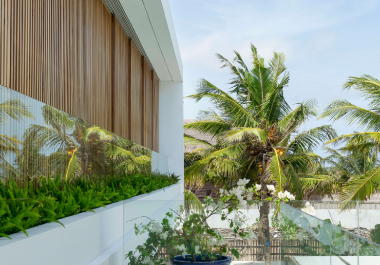 The house is oriented to the south, facing the Atlantic Ocean, with extensive overhangs and deep verandahs that recess the glazing and provide space for integrated plants to protect the interiors from direct heat and sunlight.