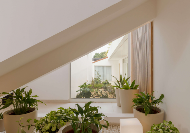 There is a formal entrance courtyard, an informal courtyard that provides discreet access to the main house, and a private patio with pool and garden. Each courtyard is individually treated with a different landscaping concept. In addition, we include water, as an element seen and heard, which helps create a fresh and fragrant microclimate in each of these outdoor spaces.