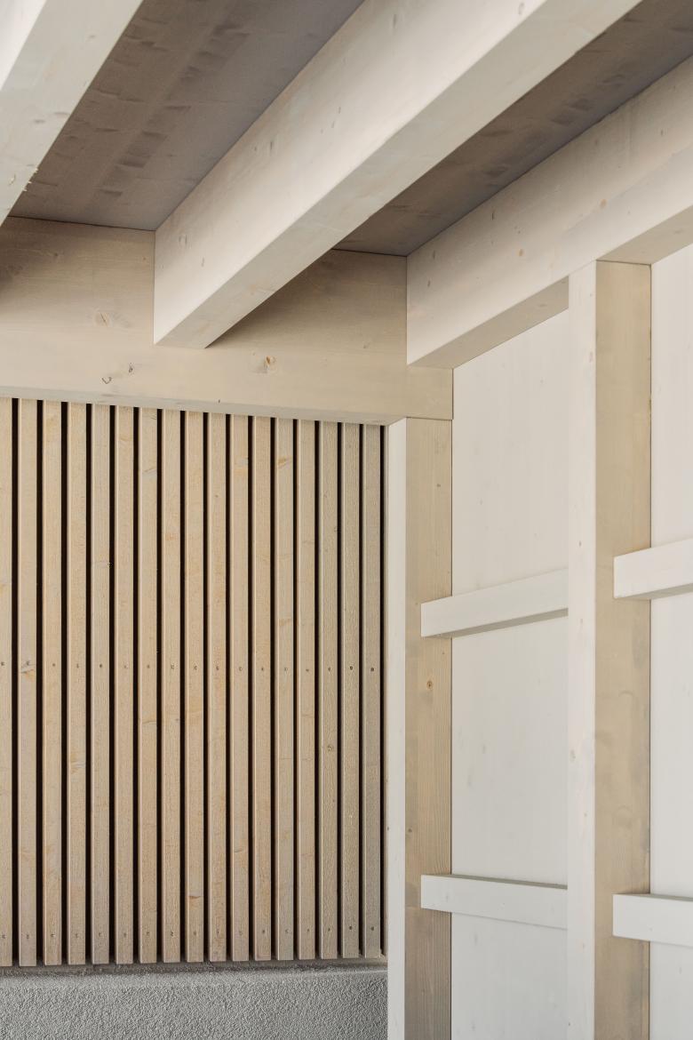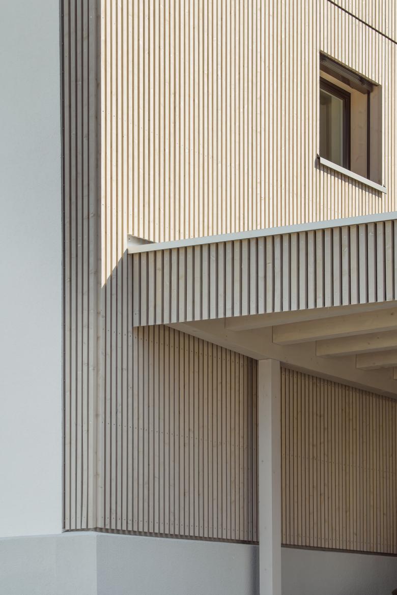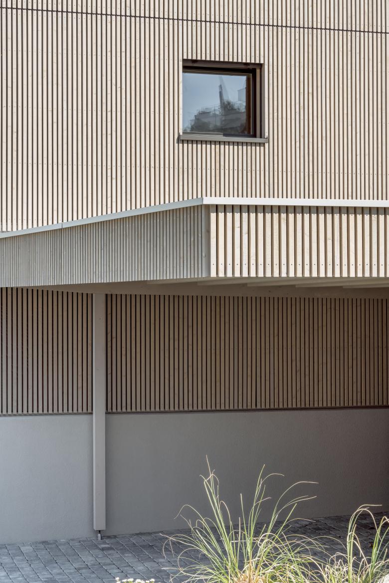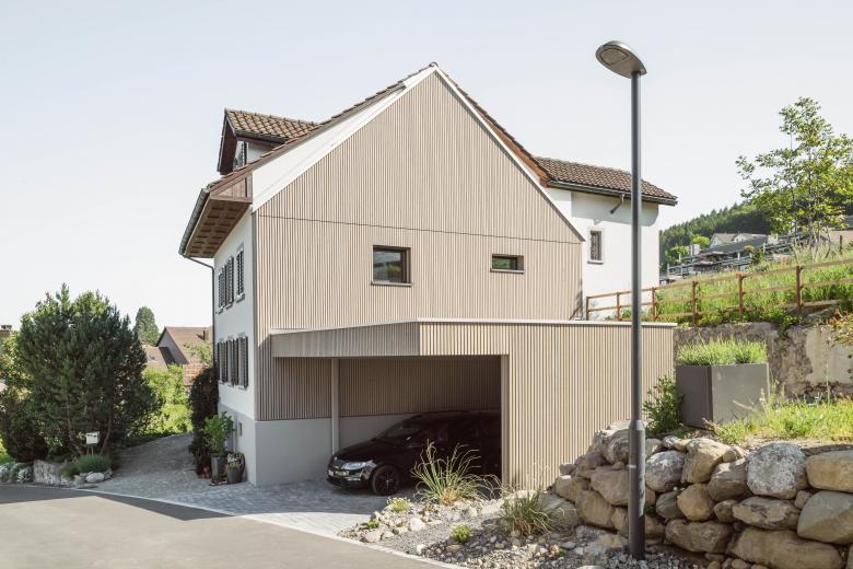 Beim einem historischen Bauernhaus wurde ein angebautes Gebäude abgerissen. Die Bauherrschaft wünschte eine neue Fassade und einen Carport. So wurde die entstandene Fassadenfläche als eigenes Volumen inszeniert und bekam eine neue Ausstrahlung. Die feine Holzstruktur wirkt lebendig und gibt dem Ort eine Referenz an das Gewesene.