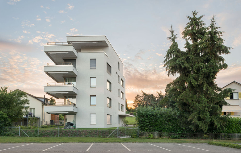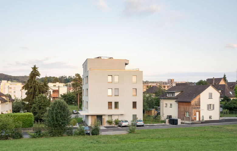 Die Aufgabe bestand darin, auf einem neu aufgezonten Grundstück Mietwohnung zu planen. Das Gebäude ist das erste seiner Art, umgeben von Einfamilienhäusern und als Neues inmitten von Bestehendem gedacht.