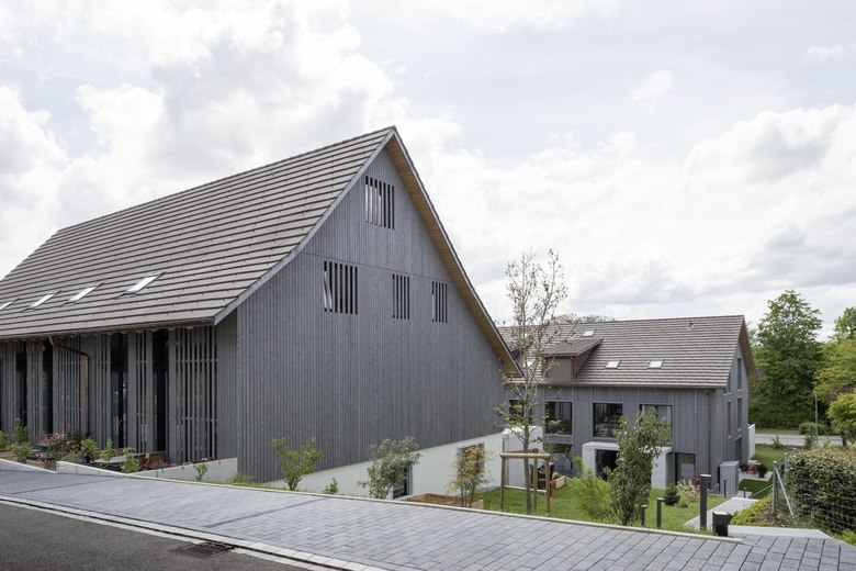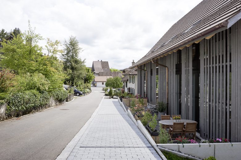 Nach einem Studienauftrag wurde der Bautyp auf Reihenhäuser festgelegt. In der weiteren Bearbeitung war wichtig, die besonderen Gegebenheiten des alten Dorfkerns und die Kernzonenbestimmungen einzubeziehen.