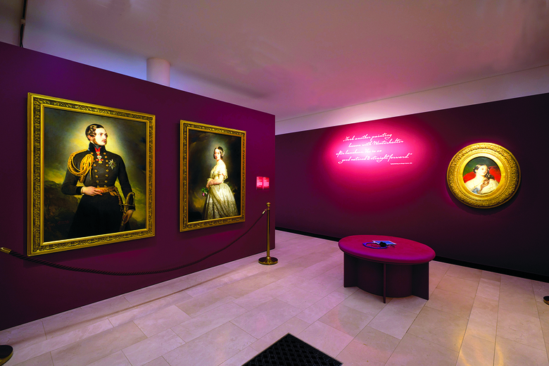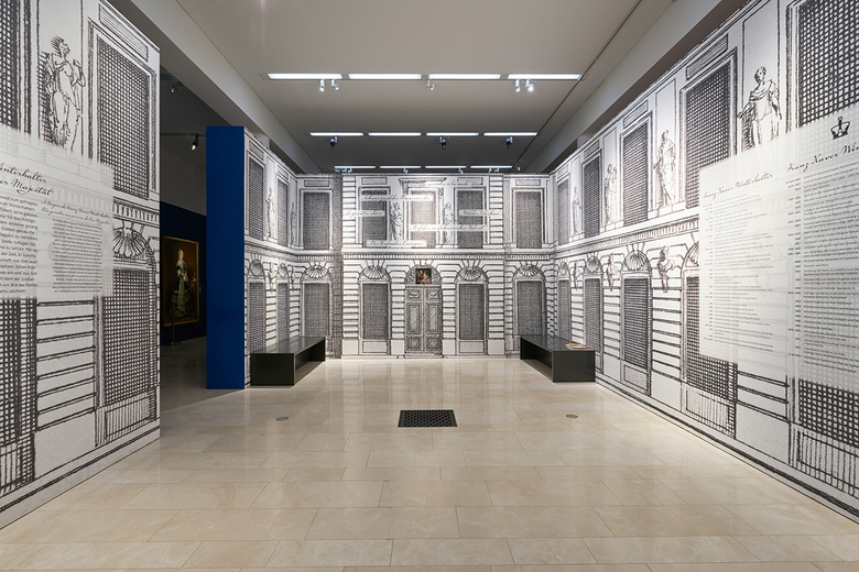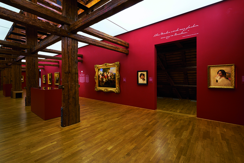 Das räumliche Konzept für das Untergeschoss ist einer Schlossarchitektur entlehnt, wo der Besucher über einen stilisierten, barocken Vorhof in eine Raumenfilade ins Innere eines Gebäudes gelangt. Geprägt wird diese Ausstellung durch eine kräftige, moderne Farbwahl der Wände, die einen Komplementärkontrast zu den darauf hängenden Bildern bieten und sie dadurch noch stärker in den Fokus rücken. Das fein akzentuierte Licht der Gemälde wurde durch eine dramatisch-theatrale Ausleuchtung noch verstärkt.