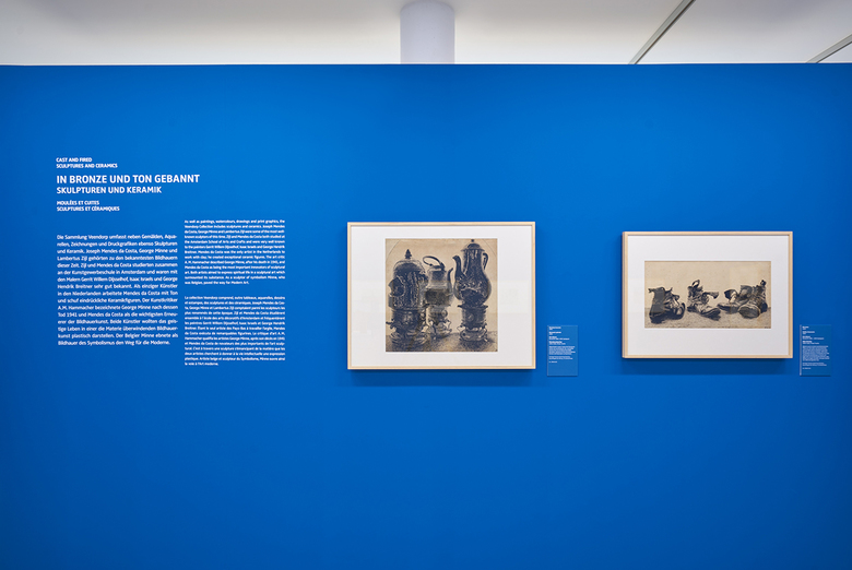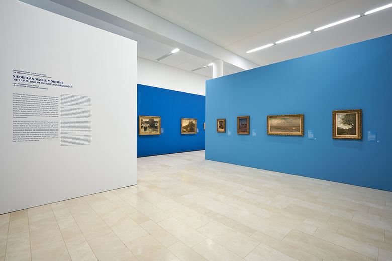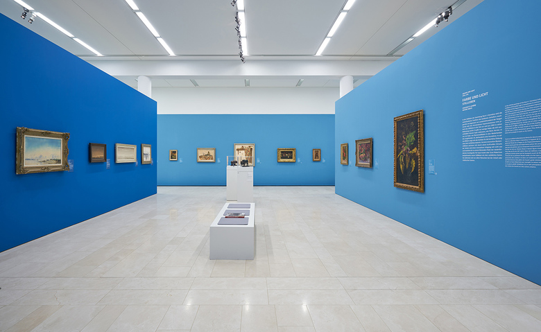 Die Ausstellungsgestaltung setzt einen frischen, farblichen Kontrapunkt zu den oft in gelb-grauen Farben gehaltenen Gemälden. Unterschiedliche Nuancen eines maritimen Blaus ziehen sich durch die verschiedenen Themenbereiche und lassen die Werke durch ihre komplementären Farben deutlich hervortreten.