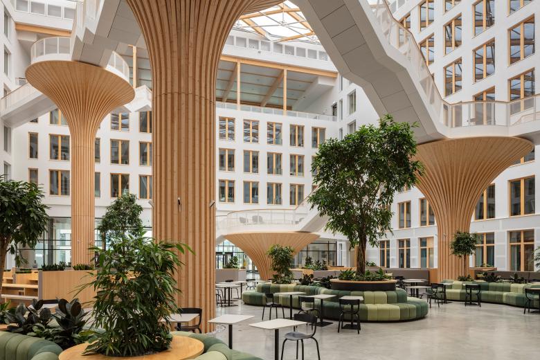 Im Herzen des Carré-Gebäudes befindet sich ein großzügiges, lichtdurchflutetes Atrium, überspannt von einem transparenten ETFE-Foliendach, das auf einer Holzbinderkonstruktion ruht. Zentraler Blickfang sind die vier in ihren Höhen abgestuften, baumähnlichen Gebilde die Aufenthaltsplattformen tragen und durch filigrane Treppen verbunden sind, die über die Plattformen hinauf zu den angrenzenden Büroetagen führen und so ein architektonisches Kommunikationsnetz bilden. Im fünften Obergeschoss befindet sich eine Sky-Lounge mit Panoramafenster. Holz findet sich sichtbar in allen Innenbereichen des Gebäudes, bereichert die klare Architektur um ein lebendiges Element und holt so den Aspekt der Natur in die einzelnen Räume des als offenes Ökosystem gedachten Bürokomplexes. Der Wald als Ursprung des prägenden Materials Holz steht so auch symbolisch unverkennbar im Zentrum der Architektur.
