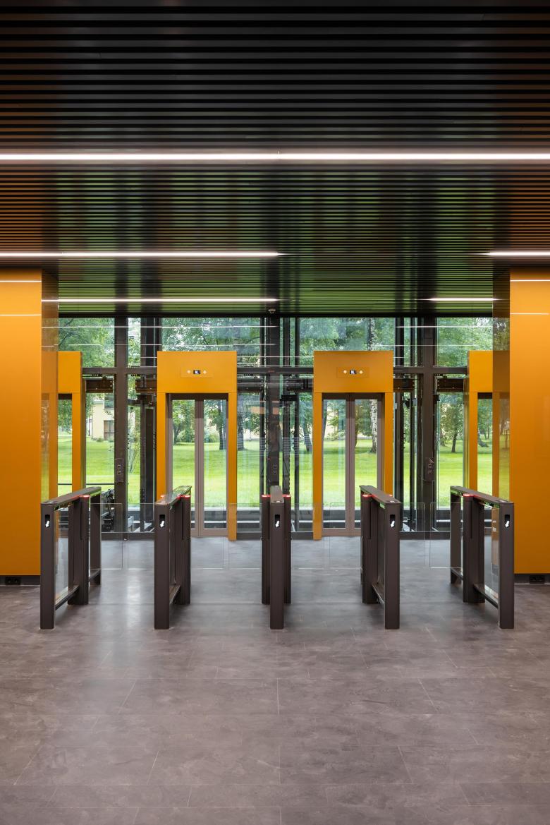 Der Haupteingang des Gebäudes wird durch ein großes Portal markiert, und das zentrale Foyer ist mit zweiseitigem Strukturglas ausgestattet, das diesen Raum mit Licht füllt und ihn visuell mit dem umliegenden Park verbindet. Die Farbgestaltung der Foyers folgt einem Konzept der Zweifarbigkeit, wobei hier das Thema „innen Gold“ zum Tragen kommt. So wechseln sich goldglänzende Aufzugsportale und Metalloberflächen in kaltem Grau ab. Die Wandverkleidungen sind aus bedrucktem Glas.