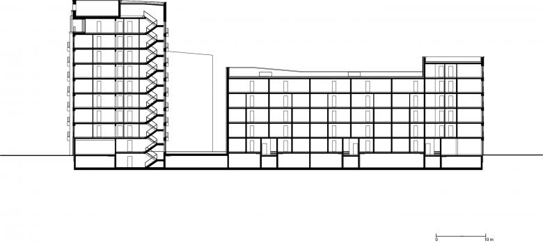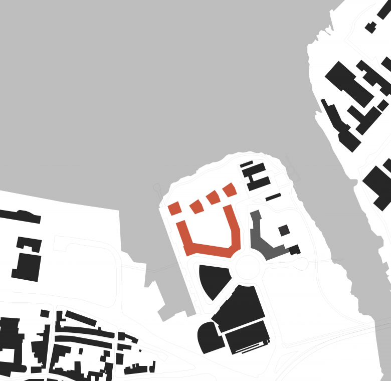 Die frische Brise, die einer Wasserstadt eigen ist, lässt sich hier durch die Formsprache deutlich spüren – die polygonalen Fassaden und abgeschrägten Dächer deuten die Hauptwindrichtungen an. Ein langgezogener U-förmiger fünf- bis sechsgeschossiger Wohnblock bildet den Rücken des Ensembles: Das Haus öffnet sich zur Warnow und gleichzeitg zu den weiteren vier Solitären mit unterschiedlicher Höhe von fünf bis neun Geschossen. Dabei übernimmt das Gebäude mit der höchsten Geschossanzahl, das direkt am Wasser platziert ist, die Rolle eines Leuchtturms in der Stadtlandschaft.