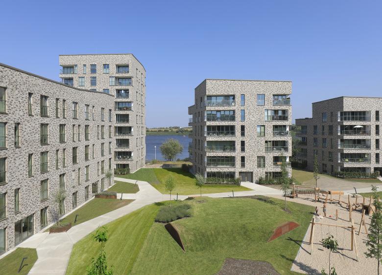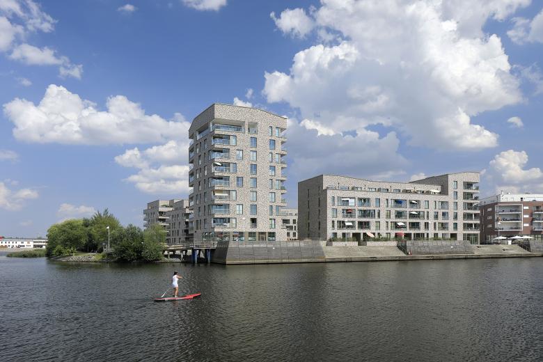 Die Verbindung der Baukörper und Freiflächen ist durch die lockere Anordnung, die Mischung von Punkthäusern und die einfassende Blockstruktur harmonisch und abwechslungsreich zugleich. Das Ensemble ist mit einer Uferpromenade samt einer breiten Treppenanlage gesäumt, die den direkten Zugang zum Wasser erlaubt. Diverse Sitzgelegenheiten sowie Spiel- und Erholungsflächen tragen in hohem Maße zur Lebensqualität der Bewohner bei. Für eine einheitliche wie lebendige Wahrnehmung sorgen die Fassaden im traditionellen Gewand aus hellgrauem und beigem Klinker.