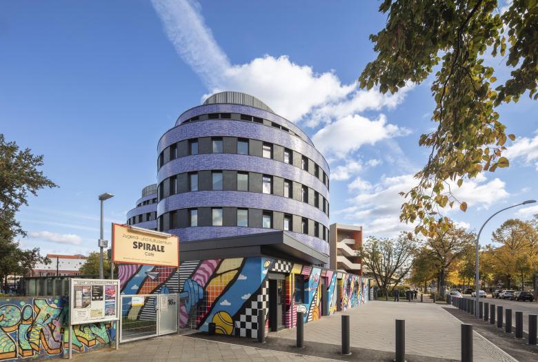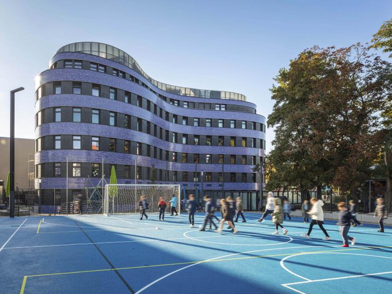 Formal und stilistisch finden sich in der Gestaltung des Schulbaus wieder Bezüge zum benachbarten Familien- und Kulturzentrum: So lässt sich ein farblicher Zusammenhang zwischen der changierend, himmelblau / nachtblau-violett glasierten, hinterlüfteten Klinkerfassade des Schulneubaus und dem blau-weiß-verglasten Eingangsportal zum jüdischen Kulturzentrum im vorderen Grundstücksteil entdecken.