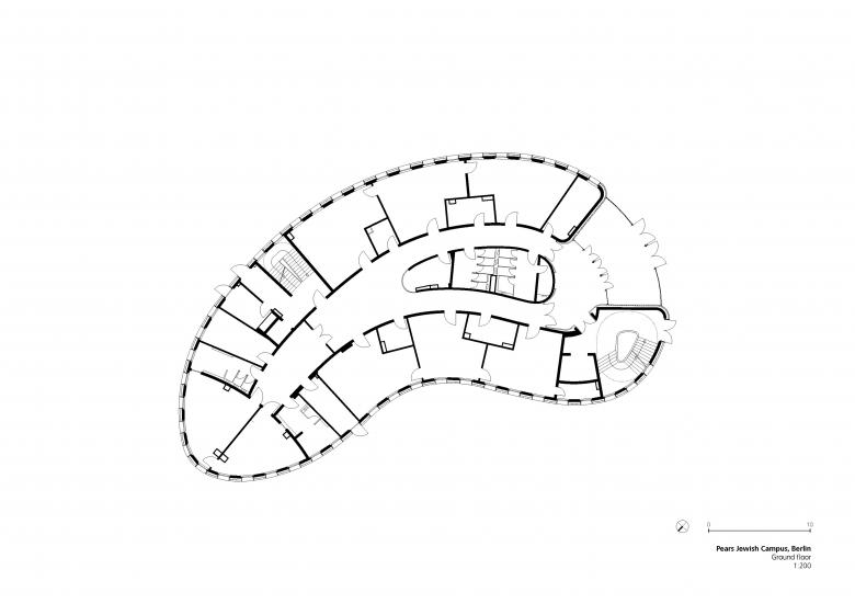 koschere Küche. Die Räume des Souterrains auf der konkaven Gebäudeseite haben Zugang zum Außenbereich. Begrünte Kaskaden mit Treppenstufen führen hier hinauf zum normalen Bodenniveau.