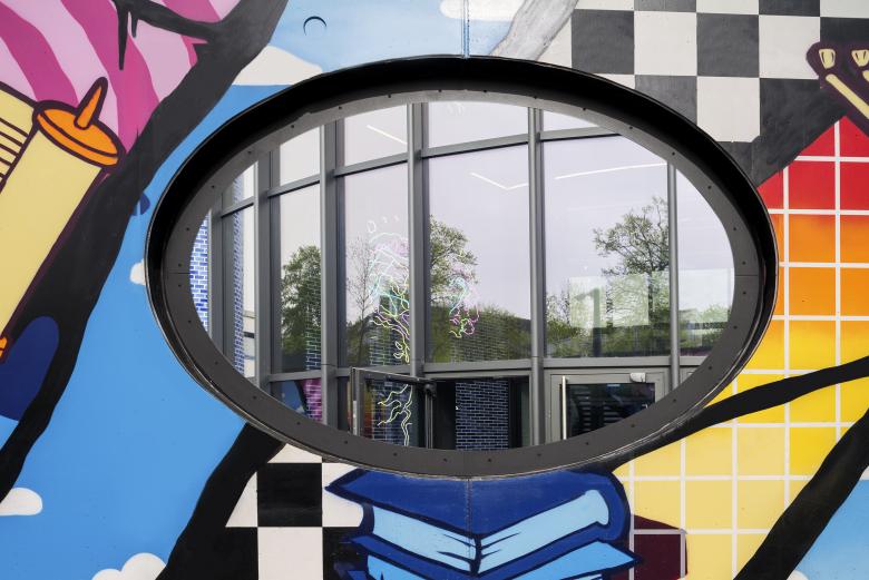 Der Haupteingang der Schule ist vom Straßenniveau aus barrierefrei zugänglich. Seine Wände zieren zwei kabbalistische Lebensbäume, Lichtinstallationen der Berliner Künstlerin Anna Nezhnaya. Die beiden Bäume, die die Menschen am Eingang zum Campus in leuchtenden Farben begrüßen, sind weniger schematisch, sondern vielmehr malerisch-poetisch gestaltet. Als Eiche und Olivenbaum stehen sie für die beiden Länder Deutschland und Israel.
