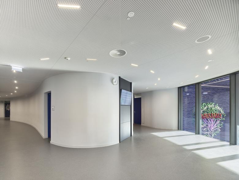 Die zweigeschossige Eingangshalle besitzt als besonderes Gestaltungselement eine verspiegelte Decke. Vom angrenzenden Treppenhaus aus sind alle Etagen über mindestens einen Aufzug rollstuhlgerecht erschließbar.
