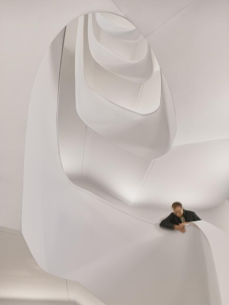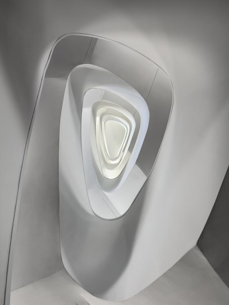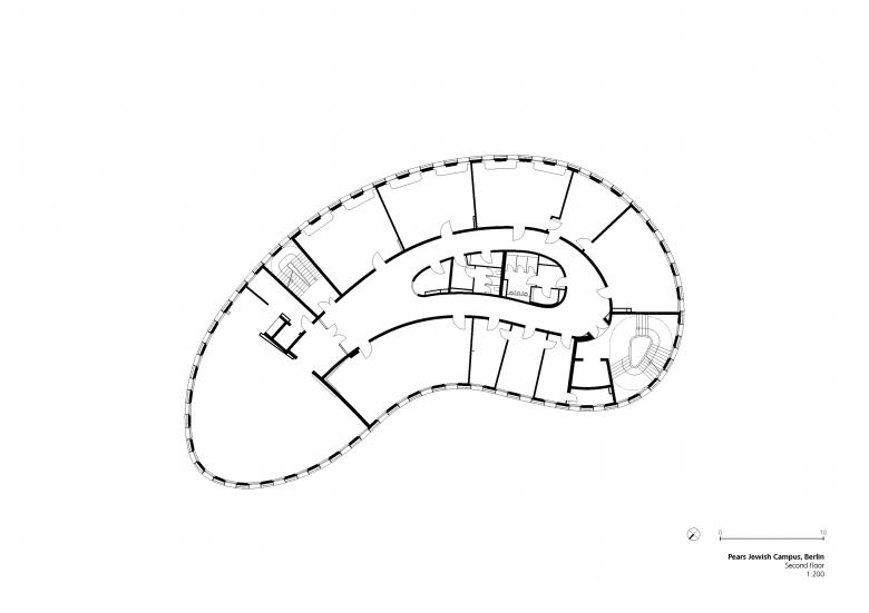 Die geschwungen-amorphe Form des Gebäudes wurde in Anlehnung an das Interieur des Chabad-Lubawitsch-Zentrums gewählt: Bewusst wurden dort die zeitgenössischen Additionen zum rechtwinkligen, neo-klassizistischen Bestandsgebäude in derselben organischen, durch eine horizontale