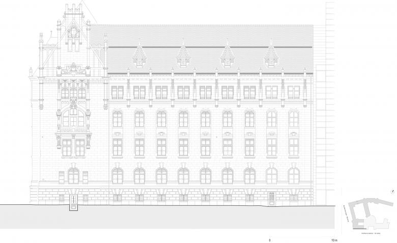 Einen bedeutenden Teil der Baumaßnahmen nahm die denkmalgerechte Sanierung der Fassaden ein. Im Bereich der Hauptfassaden sind sie Fassaden teilweise oder vollständig mit Granit und Sandstein verblendet, an Nebenfassaden wurde Klinker als Sockelausbildung oder Fenstergewände eingesetzt. Nach der Schadens- und Maßnahmenkartierung wurde ein detaillierter Maßnahmenplan zum Erhalt des Materials, wie Einsatz von Vierungen und von Steinersatz erarbeitet: Grundsätzlich wurde auf einen Austausch von Natursteinelementen, wie z. B. Gewänden verzichtet. Für den Teilersatz der Klinker wurden passende Steine bemustert. Der Außenputz wurde dem Bestandsputz nachgestellt und erhielt eine neue Fassung.