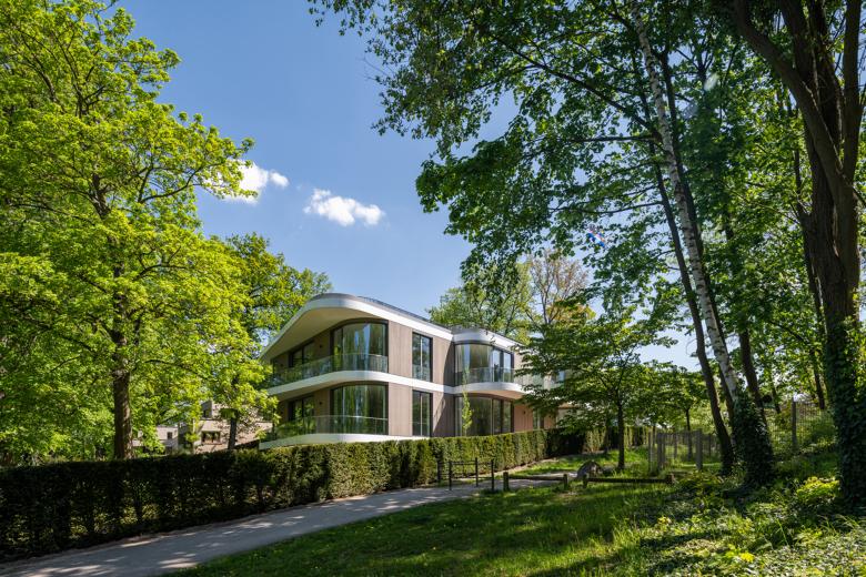 Die hinterlüftete Holzfassade aus Rhombusleisten in lasierter Thermoesche strukturiert die Fassade vertikal. Horizontal wird die Fassade durch weiße, witterungsbeständig beschichtete Metallblechbänder unterteilt. Die ausdrucksvollen Fensterrundungen und ausladenden Balkone akzentuieren die Fassade und Gebäudeform zusätzlich, ermöglichen großzügige Blickbeziehungen auf den Griebnitzsee und holen die umliegende Natur in das Innere des Gebäudes. Öffenbare bodentiefe Aluminium-Blockfenster sorgen für lichtdurchflutete Innenräume. Die Balkone sind ab dem Gartengeschoss mit absturzgesicherten Glasbrüstungen versehen, deren Streifenmuster mit der vertikalen Strukturierung der Holzfassade korrespondiert. Die Süd-, Ost- und Westfassade verfügt über einen motorisch gesteuerten textilen Sonnenschutz als Vertikalmarkise.