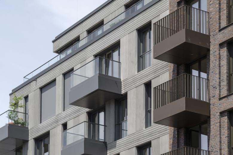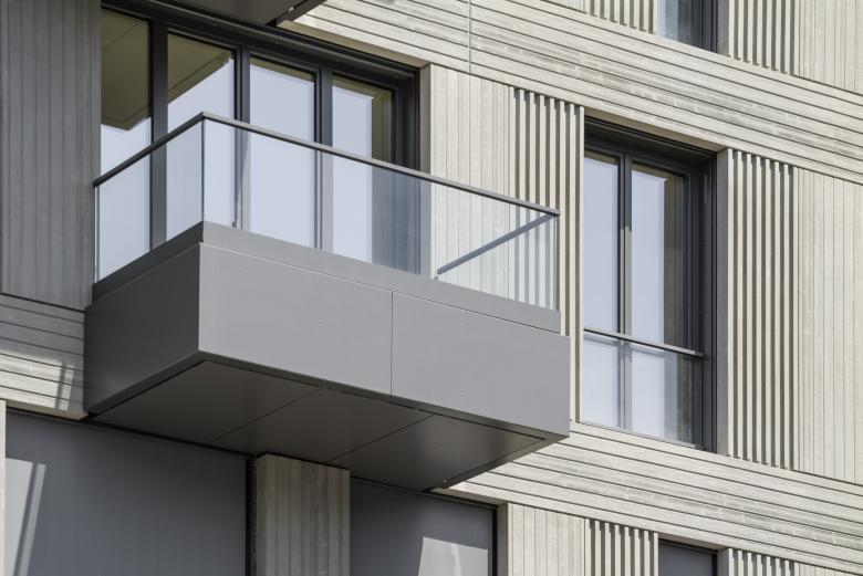 Fensterfaschen und Blindfensterfelder wurden zusätzlich durch Rücksprünge, Riffelungen oder Farbakzente betont und aufgelockert. Mit unterschiedlichen Ausführungen der Balkone wird das lebendige Fassadenbild intensiviert. Glasbrüstungen wurden passend zu Betonoberflächen verwendet, individuelle Metallgeländer wurden für Mauerwerkfassaden vorgesehen.