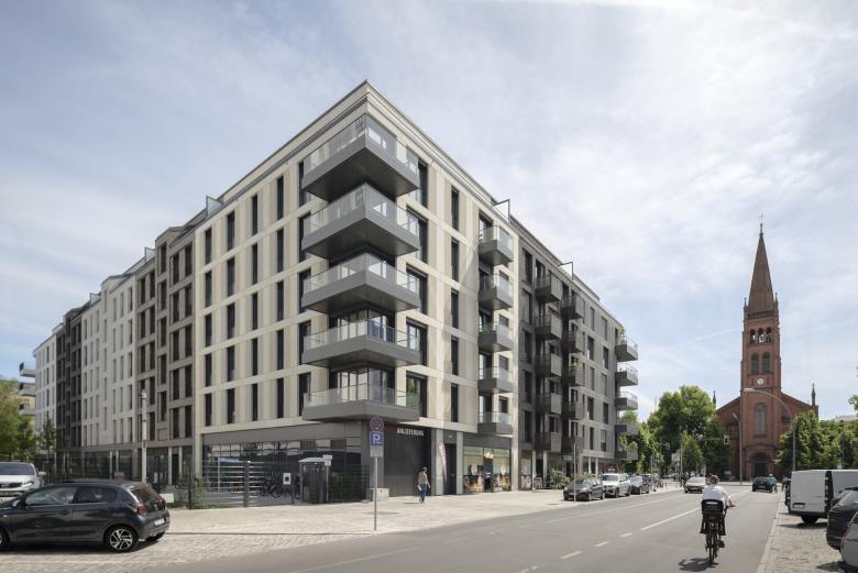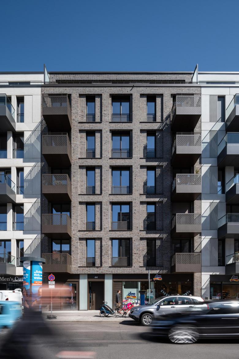 Architekturbeton und Mauerwerk sind die Ausgangsmaterialien der Fassadengestaltung und wurden je nach Gebäude unterschiedlich ausgeführt. Die rauen Strukturen einer Beton-Holzschalung wechseln sich mit glattem Sichtbeton und fein geschliffener Travertin-Optik ab. Bei der Klinkerverkleidung wurden wiederum unterschiedliche Farb- und Mustervariationen verwendet. Die Gestaltungsvielfalt der Fassaden passt perfekt in das abwechslungsreiche Straßenbild. Die Wahl der einzelnen Materialien für die facettenreichen Fassaden ist eine Referenz an das architektonische Erbe Berlins: Ziegel, Mauerwerk in Farb- und Mustervariationen verweisen auf Kirchen- und Industriebauten, kannelierter Putz auf die Gründerzeit, Sichtbeton und Glas sprechen die Sprache des heutigen Berlins. Die verputzten Fassaden im Innenhof zeigen mit Farben und Oberflächen eine ähnliche Gestaltung wie die Straßenfassaden.