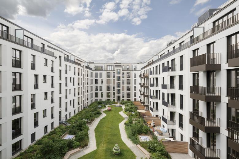 Insgesamt entstanden hier 182 Wohnungen. Die Größe der Ein- bis Zwei-Zimmer-Wohnungen bewegt sich zwischen 46 und 146 Quadratmetern. Im Norden und Osten erhalten die Erdgeschosswohnungen Terrassenflächen mit kleinen Vorgärten aus Strauch- und Baumbepflanzungen und Spielbereichen.