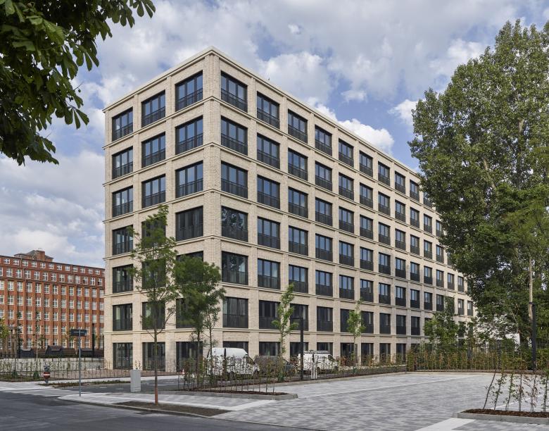 Mauerwerk, Architekturbeton und Metall schaffen atmosphärische, technisch wirkende Details, die gestalterisch wie funktional die Entstehung flexibler, zeitgemäßer und großzügiger Arbeitswelten unterstützen. Als Referenz an die Gestaltung und Materialität der Fassaden der historischen Bestandsbauten sind die neuen Bürogebäude in einem matten, pastellfarbenen Klinkermauerwerk mit changierendem Farbmuster ausgeführt und durch ein klares Fenster- und Ausbauraster charakterisiert. Zudem definieren geschossweise Gesimse sowie Faschen und Lisenen die Fassade und heben sowohl die Fensteröffnungen als auch die Zugänge innerhalb der zweigeschossigen Fassade im Erdgeschoss hervor. Ein mit dem Raumregler verbundener Kontakt ist in den Fenstern montiert und ermöglicht das Regulieren und Abschalten der Lüftung/Klimatisierung bei geöffnetem Fenster. Zusätzlich befindet sich an den Ost-, Süd- und Westseiten ein außenliegender Sonnenschutz.