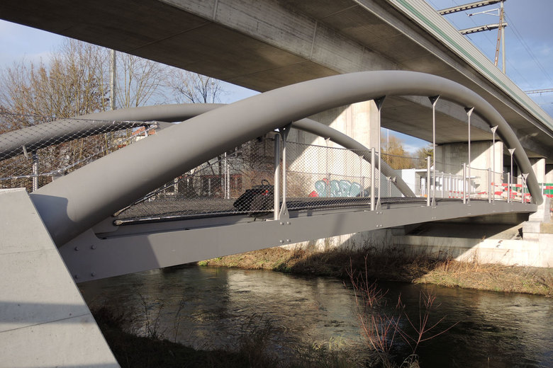Die Fussgänger- und Werkleitungsbrücke spannt 24.5m über den Fluss Glatt und weist eine Breite von 6.5m auf. Die Haupttragkonstruktion der Stahlbrücke besteht aus zwei Bögen mit Rohrquerschnitt. Die Bögen sind für die Gewährleistung der horizontalen Stabilität in die Widerlager eingespannt. An den Bögen aufgehängt ist die Fahrbahnplatte welche aus gevouteten Querträgern mit I-Querschnitt im Abstand von ca. 2.6m und einer darüber liegenden ausgerippten Blechwanne besteht. Für die Durchführung der Werkleitungen sind die Querträger mit Aussparungen versehen. Ein auf die Blechwanne aufgebrachter Asphaltbelag bildet die Fahrbahn der Brücke. Aufgrund des schlecht tragfähigen Baugrundes ist die Brücke mit je zwei Grossbohrpfählen pro Widerlager fundiert.