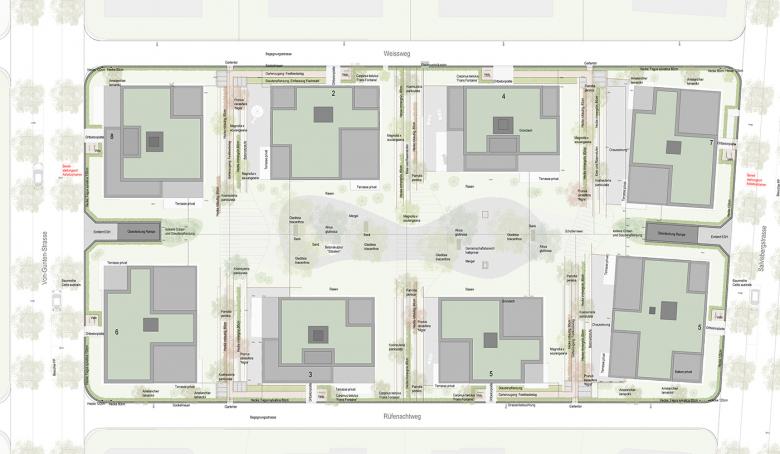 Im Inneren spannt sich ein grosszügiger, gemeinschaftlich genutzter Parkraum auf. Unter Baumkronen lädt eine Rasen- und Kiesfläche zum Sitzen, Treffen oder Spielen ein. In den schmaleren Bereichen zwischen den einzelnen Häusern werden die Höhendifferenzen im Gelände durch lineare Stahlkanten und Stufen aufgenommen. Diese sind jeweils mit den
