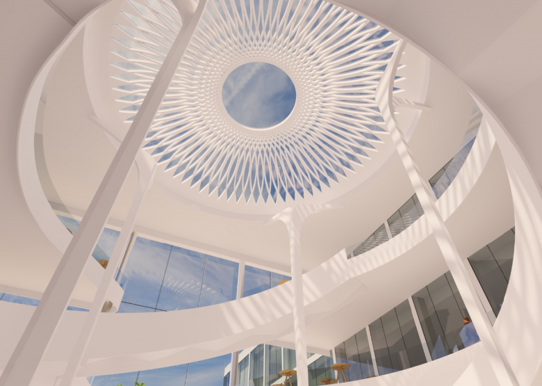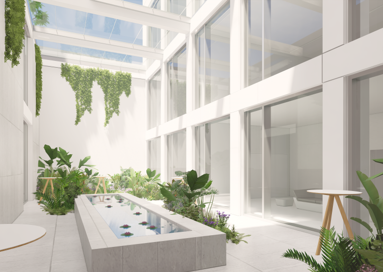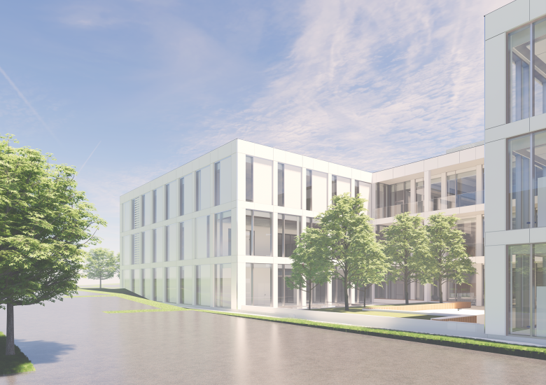 Die Labore, Verwaltung sowie der Co-Working Bereich richten sich zu einem gedeckten Atrium und geöffneten Innenhof zum grossen Park, über welchen gepflegte Fahrrad- und Fusswege, das Gebäude mit der Stadt, dem Bahnhof und den öffentlichen Bereichen verbindet.