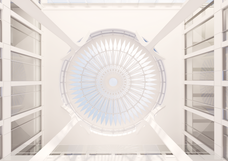 Als Überdachung und Symbol der Vision des Unternehmens und seines Engagements für die Ophthalmologie wurde eine grazile Kuppel konzipiert, deren «Irisschatten» bei Sonnenschein auf den Boden des Atriums projiziert wird. Vier vitale Laubbäume, welche sich unmittelbar vor dem Haupteingang befinden, bilden die Fortsetzung zum angrenzenden Walde. Sie leisten dadurch einen wichtigen Beitrag zur Eingliederung von «Polaris» in sein unmittelbares Umfeld.