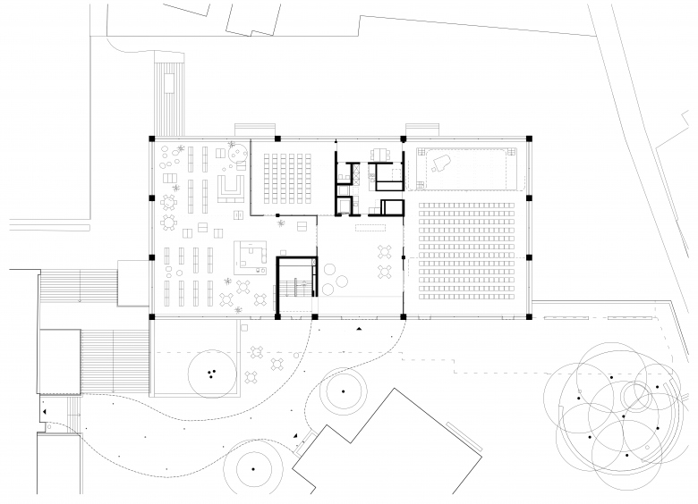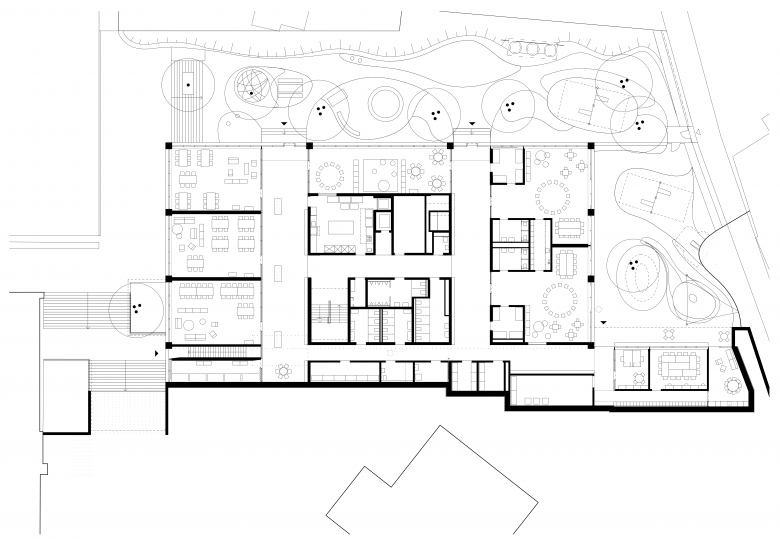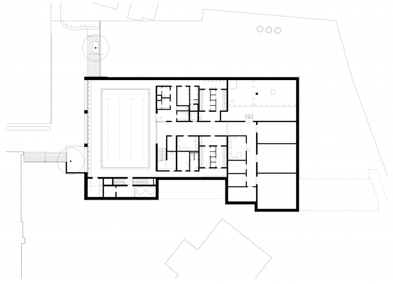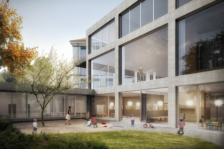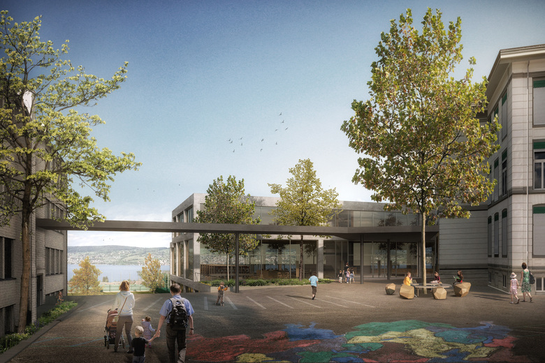 Dorf- und Pausenplatz. Aula, Saal, Bibliothek/Mediathek, 5 Klassenzimmer, Gruppenräume, Schulverwaltung, Hort, Krippe, Schulschwimmanlage. Minergiestandard.