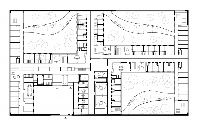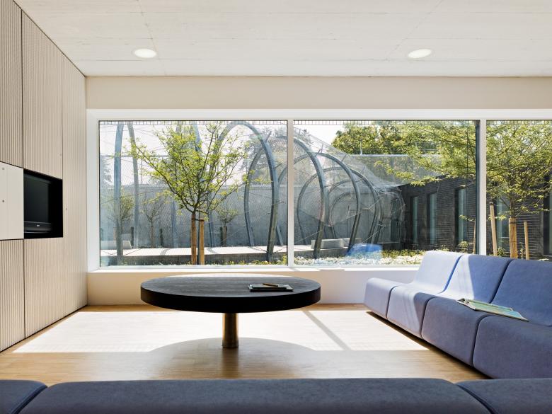 3 Stationen für je 9 Patienten mit Aufenthalts-, Arbeits- und Therapieräumen. Personal-, Eintritt- / Austritt- und Besucherbereiche. Gymnastikraum und Andachtsraum. Hoher Sicherheitsstandard. Minergiestandard.