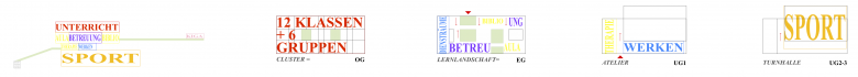 - Neubau mit 12 Klassenzimmern als Tagesschule, Bibliothek / Mediathek, Mensa, Mehrzweckraum / Aula, Doppelturnhalle, Kindergarten, Pausen- und Sportplätze