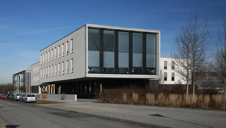 Der t-förmige Gebäudekomplex resultiert aus den Vorgaben des Bebauungsplanes. Die beiden straßenbegleitenden Baukörper folgen mit ihrem Versprung der Baulinie und bilden im Erdgeschoss eine überdeckte Rampe, die von der U-Bahn kommend zum Haupteingang führt.
