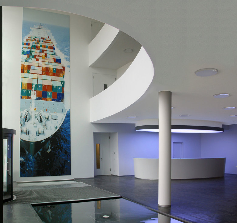 Im 1. und 2. Obergeschoss befindet sich die Verwaltung. Hinter den aufgeglasten Giebelseiten liegen Geschäftsleitung und Besprechungsräume. Alle Baukörper kragen an den Stirnseiten stützenfrei aus und prägen markant das Erscheinungsbild. In den Putzfassaden der Obergeschosse befinden sich im Ausbauraster Einzelfenster als Aluminium - Verbundkonstruktion mit integriertem Sonnenschutz.