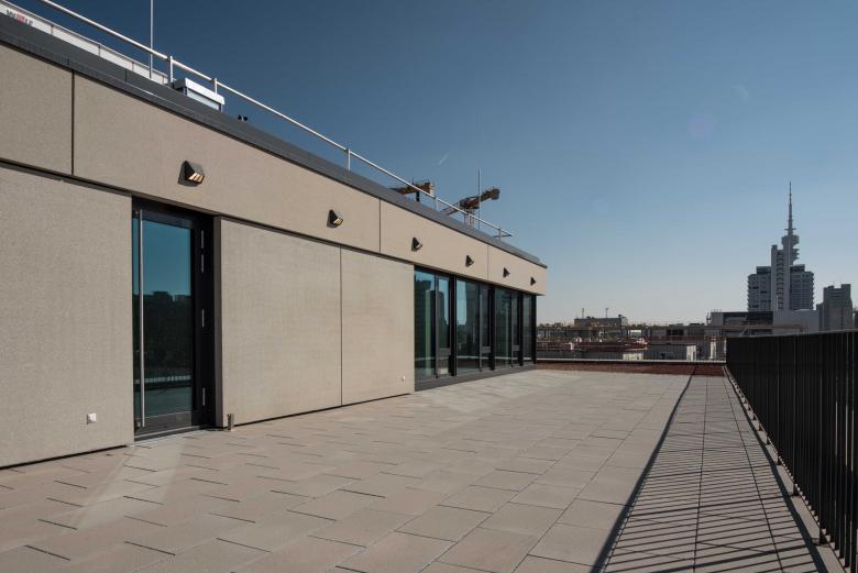 Die Fassade besteht aus vorgehängten, oberflächenveredelten Betonfertigteilen, die jeweils in der Ebene der Geschoßdecken als durchgehende Bänder ausgebildet sind. Dazwischen sind geschosshohe, senkrechte Fertigteile mit unterschiedlichen Leibungstiefen und in unterschiedlicher Drehung zur Fassadenebene eingestellt, sodass sich eine wellenartige Bewegung über die gesamte Fassadenlänge ergibt.
