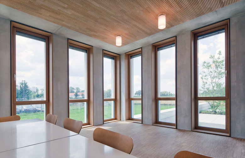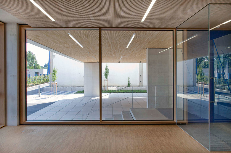 Neben dem Baustoff Beton reduzieren sich die Materialien beim Innenausbau auf Gipskarton an den Bürotrennwänden, sowie Holz an Fenstern, teilweise Böden und Decken. Die raumhohen Fenster in Holz-Alukonstruktion, mit Sonnenschutz im Scheibenzwischenraum, bestimmen den wechselnden Rhythmus der Faltung der Fassadenelemente.