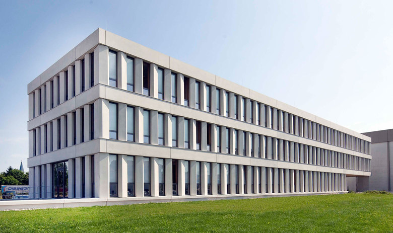 Der markante Baukörper setzt sich deutlich von der üblichen Architektur deutscher Gewerbegebiete ab. Der hohe Anspruch an handwerkliche Qualität der Bauunternehmung Hönninger kommt bei der Verarbeitung der Ortbeton-Tragstrukturen und Fertigteil-Fassadenelementen zum Ausdruck.