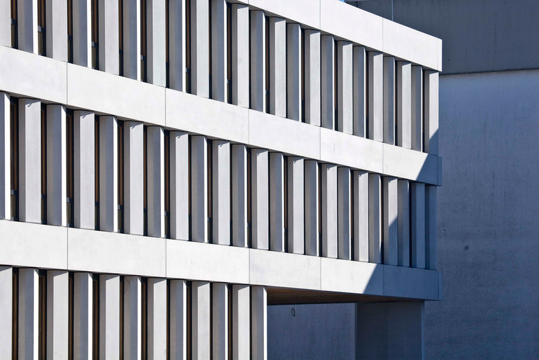 Die tragenden Bauteile der Außenwände (Ortbeton und Fertigteile), Innenwände und Stützen erhielten Glatt- und Strukturschalungen. Die Erscheinung des gegliederten Baukörpers wird durch die horizontalen- und vertikalen Stahlbeton Fertigteile bestimmt. Die wechselnde Richtung der vertikal vorgehängten Elemente verleihen der Fassade ein lebendiges Schattenspiel.