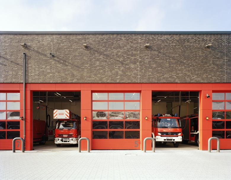 Ein dunkelgrauer Klinker bildet die äußere Haut des Gebäudes und wird zum prägenden Fassadenmaterial. Alarmrote Akzente in der Fassadengestaltung sind von überall ersichtlich und unterstreichen die Adressbildung der Feuerwache. Eine Reihe von Amberbäumen vor der Feuerwehr wirken im Herbst für einige Wochen intensiv mit ihrer »feurig« roten Herbstfärbung auf den Straßenraum.