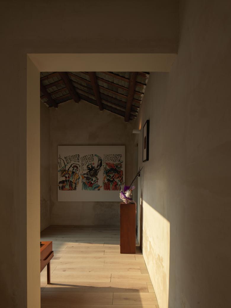 AD FUTURE invites young generations to reconnect with traditional rural life, offering an escape from urban chaos and a unique relaxation and vacation experience. This project is more than a renovation of an old house; it’s a practice in rural cultural renewal within a contemporary context. The original interiors were cramped and dim, unsuitable for modern life. The design team preserved the original architecture while completely reorganising its internal layout and window openings to welcome light and air. The bold insertion of red geometric blocks into the courtyard sparks a dynamic dialogue between modernity and tradition. Inside, wooden flooring and traditional wall textures maintain the old building’s cultural soul while enhancing its comfort. Furnishings and art weave a narrative across eras and cultures. Chaoshan artist Mr. Zheng Shaowen’s Yingge dance-inspired artworks, and contemporary oil portraits by young local painter Zhu Hui, create an engaging resonance with the architecture. In addition, a curated mix of modern fabric sofas, vintage rattan chairs from the era of Chinese migration to Southeast Asia, British ceramic carts, and Republican-era furniture—all conveying a narrative of temporal and spatial evolution.