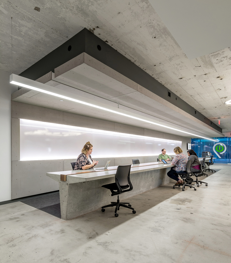 A dynamic collaboration zone established the design concept. This zone is made up of a long poured-in-place concrete table with power and data capability embedded into 40’ long six-inch strip of walnut. A contrasting homasote wall surface helps to separate this collaborative space from the lounge spaces and works to achieve optimal acoustics for discussion and concentration. A linear light overhead lines up with the power and data slots, as well as with the power nine logo at the entrance. This dynamic space accommodates breakout spaces for students to use between classes, offers space for temporary workstations, a surface for tech start-up company meetings and as a serving table for public events.