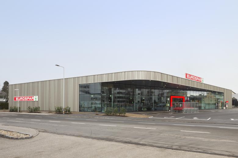 Der Bauplatz mitten im Stadtgebiet von Ried liegt am Kreuzungspunkt zweier verkehrsreicher Straßen. In einem städtebaulich recht ungeordneten Umfeld mit Gewerbebetrieben, einer Tankstelle, mehrgeschossigen Wohnbauten sowie Einfamilienhäusern soll sich der Unternehmensgeist – die „corporate identity“ – in gebauter Form manifestieren. Der neue EUROSPAR nutzt die engen Grenzen des Baufeldes optimal aus. Das Gebäude ist als Großform konzipiert um damit im kleinteiligen heterogenen Umfeld als Landmark wahrgenommen zu werden. Die elegante, geschwungene Fassade aus profilierten Blechpaneelen unterstreicht diesen Entwurfsgedanken. Die Neuordnung und Begradigung der Parkplätze unter Beibehaltung der bestehenden Einfahrten dient der Übersichtlichkeit und besseren Orientierung für die Kunden. Die Gebäudeform erklärt sich aus einem nahezu rechteckigen Kubus, dessen Eingangsfront in Abstimmung auf die bestehende Einfahrt eingedrückt wird, sodass ein gedeckter Eingangsbereich unter dem Vordach entsteht. Der Markt öffnet sich zum Parkplatz hin mit einer breiten, einladenden Glasfront hinter welcher sich im Inneren ein offener, heller Marktplatz präsentiert.