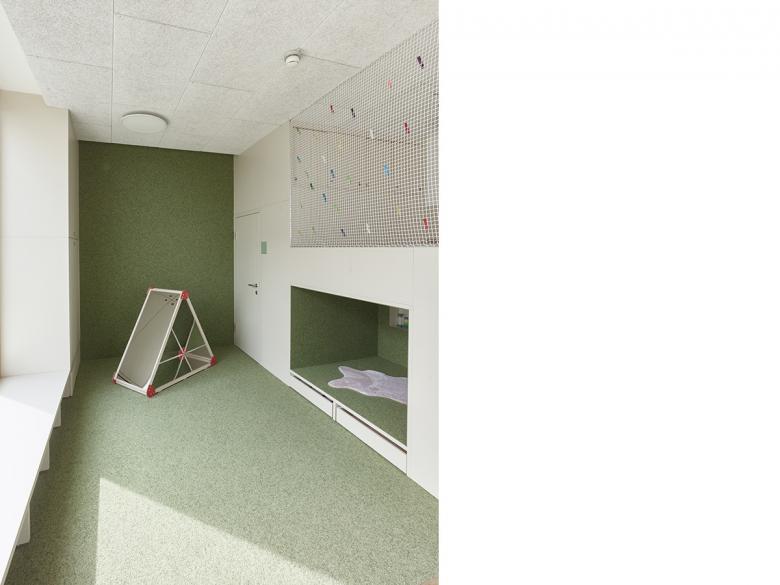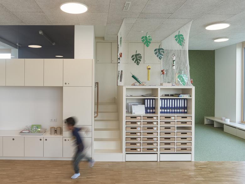 Jeder Gruppenraum bildet durch seine L-förmige Gestaltung und materielle Differenzierung offene Zonen und Rückzugsbereiche. Die Kinder können durch Raummöbel, Nischen, erhöhte Podeste und Fenstersitznischen eine Vielzahl an Raumeindrücken erleben. Sie können sich viele Wände im Gebäude durch bemalen oder aufhängen von eigenen Kunstwerken aneignen.