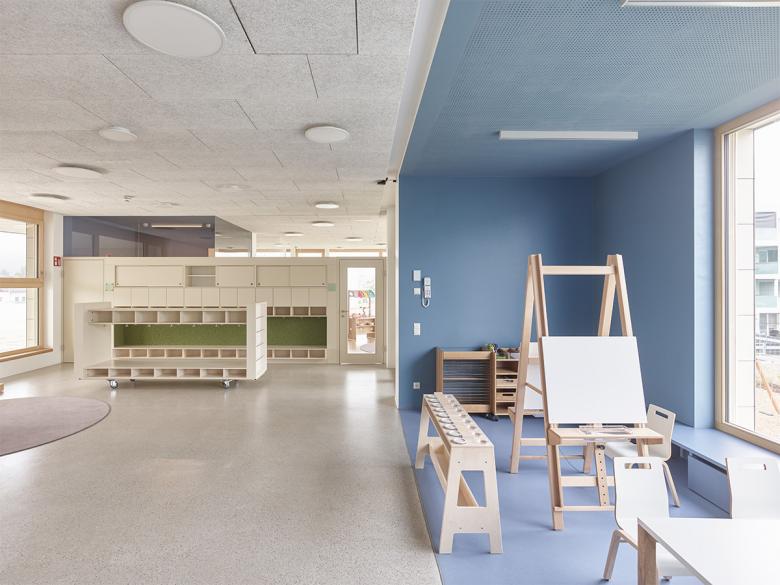 Der Entwurf folgt dem zeitgenössischen pädagogisches Konzept eines offenen Hauses, nachdem Kinder zwischen thematisch spezialisierten Gruppenbereichen nach eigenem belieben wechseln dürfen. Oberlichter und verglaste Türen verbinden die Gruppenräume mit den Allgemeinflächen zu einem großzügigen Raumgefüge. Rollende Garderobenmöbel laden ein die Mehrzweckräume mit unterschiedlichen Raumkonfigurationen zu bespielen.