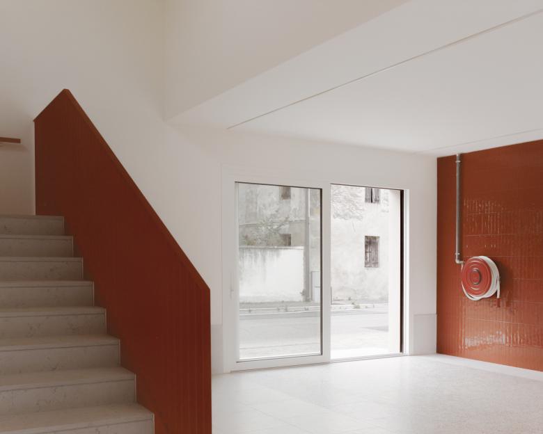 The lower building stands on the opposite side from the road and with its retreat defines the public space, which is further clarified by the presence of the samll garden.