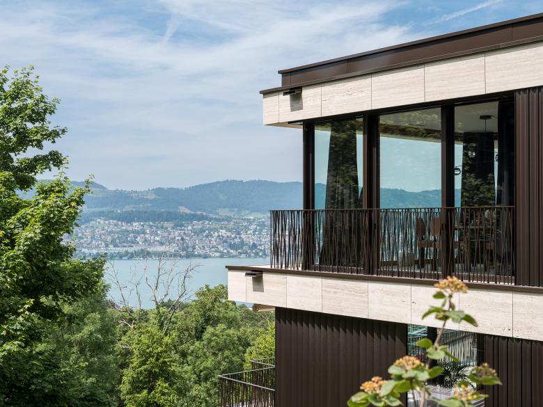 Die Architektur zeichnet sich durch eine klare und kubische Form aus und steht im Gegensatz zur umgebenden «wilden» Natur. Die Materialisierung ist geprägt von beigen Travertin-Naturstein einerseits, andererseits von einem bronzefarbigen unregelmässig gewellten Fassadenblech. Die feinen Staketengeländer bilden zusammen mit den raumhohen Lamellen das dritte fassadenbildende Element. Alle drei Elemente fügen sich zu einer hochwertigen und wohl austarierten Komposition zusammen. Der klaren und schnörkellosen architektonischen Gestaltung wird eine naturbelassene Umgebung gegenübergestellt, welche so den Bezug zum naheliegenden Wald und Tobel herstellt.