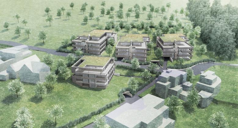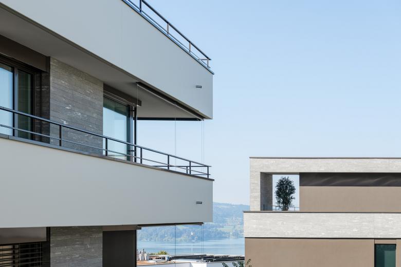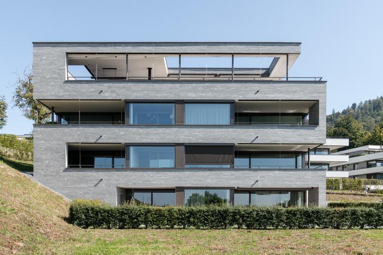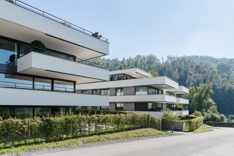 Oberhalb der Stadt Zug am Fusse des Zugerbergs gelegen, wurde der Rötelberg von der Stadt selbst als eine von fünf sogenannten «Perlen» auserkoren: Orte, deren spezielle Nutzung mit hohen Anforderungen an die städtebauliche, landschaftliche und architektonische Gestaltung einhergeht. Auf knapp 12‘000 m2 Land, unweit der Verenakapelle aus dem 18. Jahrhundert, entstanden vier Mehrparteienhäuser. Horizontale Elemente prägen den Entwurf. Die vier individuellen Baukörper, die sich aufgefächert präsentieren und leicht abgedreht dem Hügel entlang platziert sind, sorgen dafür, dass ein Wechselspiel mit der Umgebung stattfindet. Die Wohnüberbauung «Rötelberg» mit 32 hochwertigen Eigentumswohnung bietet trotz des verdichteten Bauens viel Privatsphäre und Flexibilität im Grundriss.