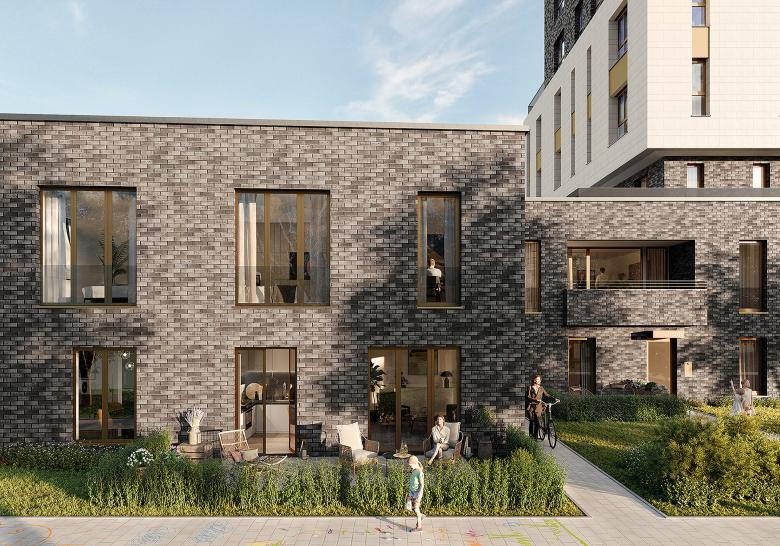 Das Bebauungskonzept sieht einen rechteckigen, 13-geschossigen Baukörper (Hochpunkt „E") auf einem zweigeschossigen Sockelbau mit einer Wohnfläche von ca. 10.000 qm vor. Während im Hochpunkt auf den Etagen Geschosswohnungsbau realisiert wird, befinden sich im Sockel zweigeschossige Maisonettewohnungen sowie der Eingangsbereich des Hochhauses. Nahezu das gesamte Grundstück wird mit einer zweigeschossigen Tiefgarage unterbaut, die neben den Stellplätzen auch die Mieterkeller aufnimmt. Die Baumaßnahme soll im Effizienzhausstandard gemäß KfW55 umgesetzt werden.