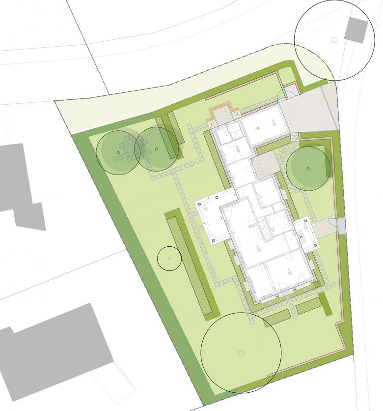 Ein neues Beet bestehend aus Katzenminze, Lavendel, Schwertlilie, Zistrose und weiteren trockenheitsverträglichen Blütenstauden umgibt das Haus und bildet einen sanften Übergang vom Gebauten zum Gewachsenen. Zusätzlich werden der Vorgarten und der Sitzplatz mit neu gepflanzten Bäumen akzentuiert. In Abweichung zur ursprünglichen linearen Anordnung der Bäume stehen die zwei Zierkirschen, welche dem Sitzplatz Schatten spenden und das Gelbholz, welches den Vorgarten prägt, wie die bestehende Linde als Solitäre im jeweiligen Gartenraum.