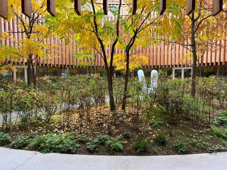 Die Umgebung bindet das neue Kinderspital und das neue Forschungszentrum in den Landschaftsraum Burghölzli ein. Die umliegende Landschaft ist geprägt von parkartigen Gartenteilen, Umgebungen von Spitalbauten aus verschiedenen Epochen sowie von landwirtschaftlich genutztem Kulturland mit Obstwiesen und Weinbaukulturen. Die Vorzone entlang der Lengg- und August Forellstrasse bildet die neue Adresse und verbindet die beiden Haupteingänge. Das runde Forschungszentrum wird von einer Obstwiese umspielt und bettet sich in die natürliche Hanglage der Parzelle ein. Um das neue Kinderspital ensteht eine gestalterisch dichte, kindergerechte Spitalumgebung mit einer Vielfalt an erlebbaren Garten-, Park- und Landschaftsräumen. Durch das flächige Volumen des Spitalneubaus werden die Höfe zu wichtigen Gartenräumen. Sie bringen als ‚grüne Zimmer‘ die Natur ins Gebäude und schaffen Geborgenheit und Orientierung. Die geschwungene Wegeführung mit einem Baumhain aus Zieräpfeln und langgezogenen Sitzbänken schafft einen öffentlichen Freiraum mit Promenadencharakter und Aufenthaltsqualität.