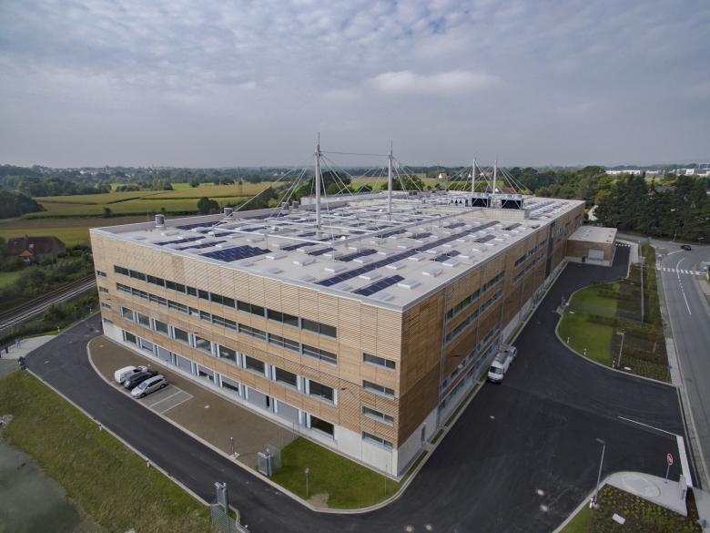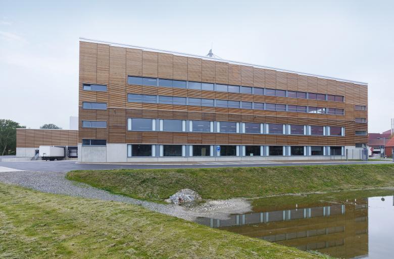 Der Industriebau besteht aus zwei übereinander liegenden beinahe stützenfreien Fertigungsflächen, auf rund 25.000 qm, mit vier Höhenebenen. Die Fertigungshalle ist aus einer Stahl-Holz-Stahlbeton Hybridkonstruktion gebaut mit einer hinterlüfteten Lärchenholzfassade.
